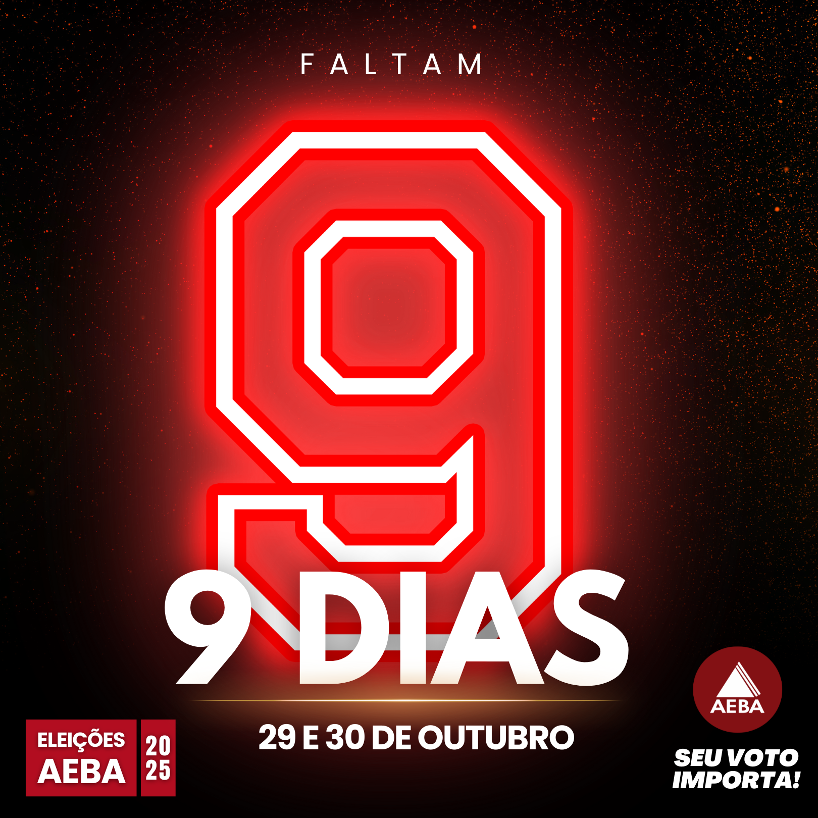 Faltam apenas 09 dias para as eleições da AEBA. Esteja atento(a) às orientações que serão divulgadas nos próximos dias!