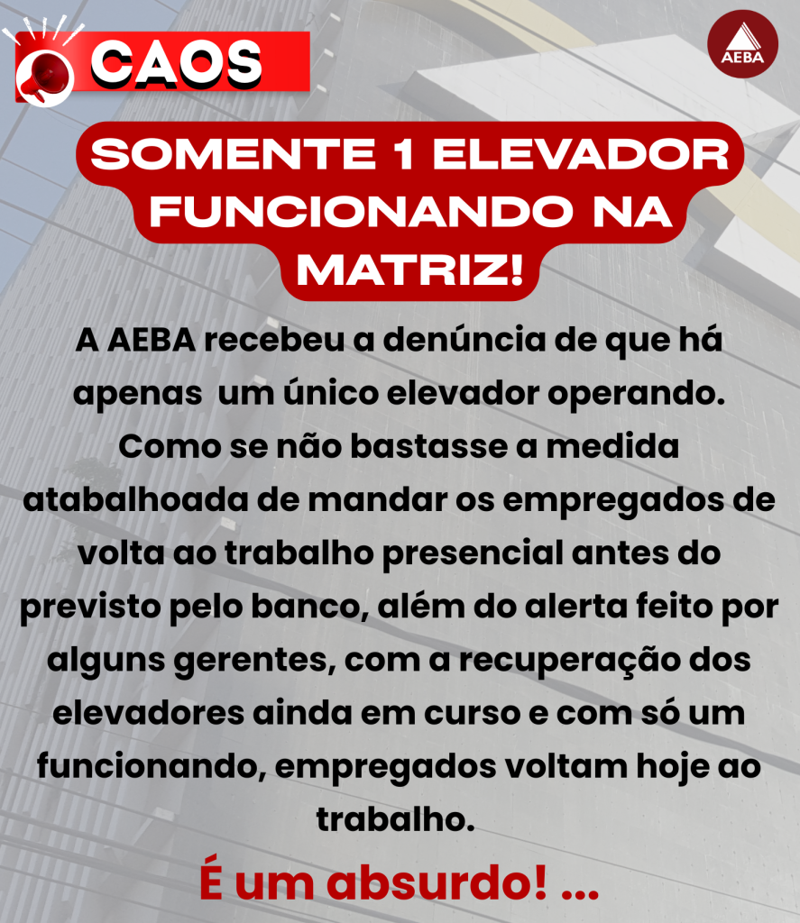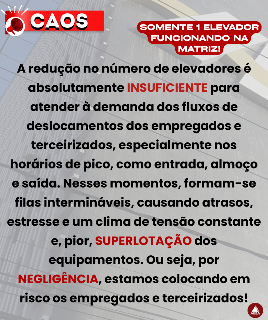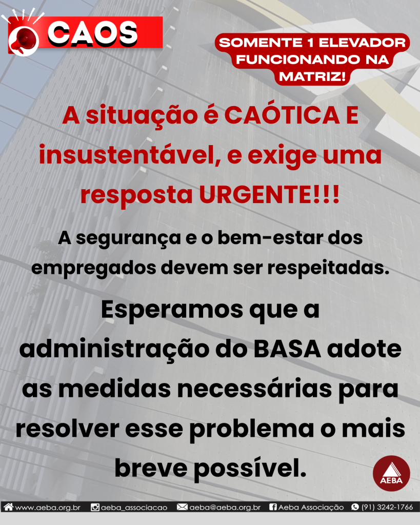 Com a desculpa de que o trânsito na capital paraense estava “tranquilo” mesmo em meio à COP 30, BASA tem problema de tráfego interno, com a penas um elevador funcionando para atender ao deslocamento em toda a matriz. Um verdadeiro absurdo e irresponsabilidade, que põe em risco as pessoas com a sobrecarga e superlotação de apenas um único elevador operando para todo o fluxo da sede.