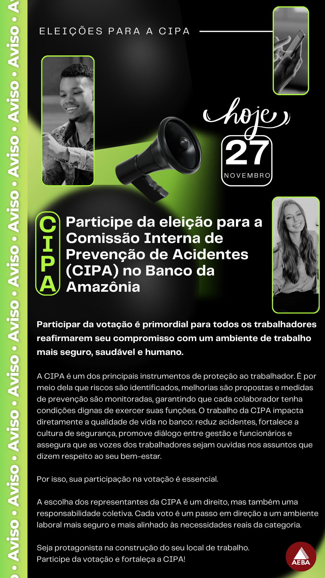 Banco da Amazônia AEBA convoca para Assembléia Geral dos Associados, amanhã (30/04) Posted on 29/04/201304/10/2017 A Diretoria da AEBA convoca seus associados para participarem da Assembléia Geral Ordinária que será realizada amanhã, dia 30 de abril. A Assembléia deliberará... Leia mais