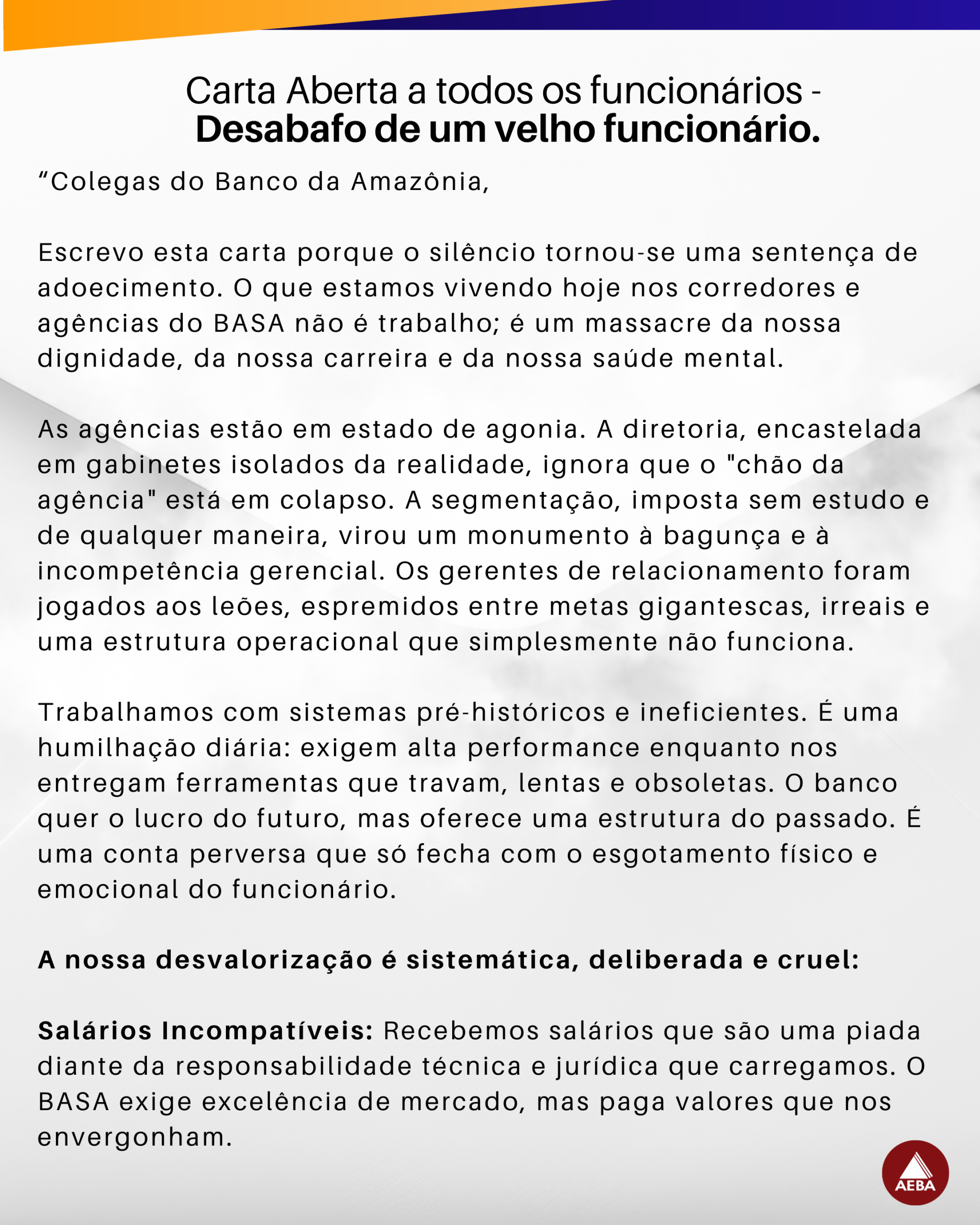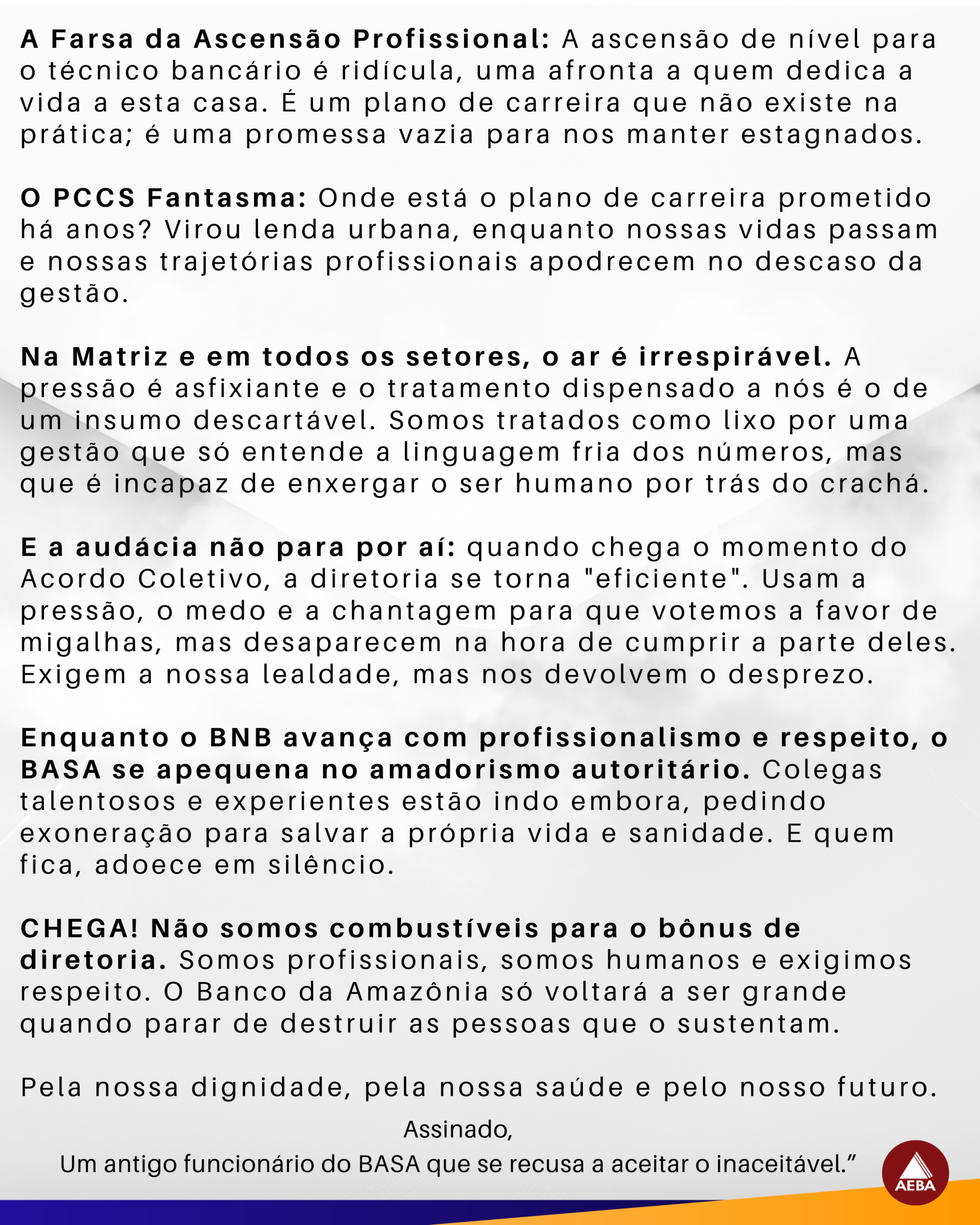 A AEBA recebeu anonimamente a carta de um ex-empregado do banco com o assunto: “Desabafo de um antigo funcionário do BASA – por favor, leiam!”, a qual compartilhamos a seu pedido.