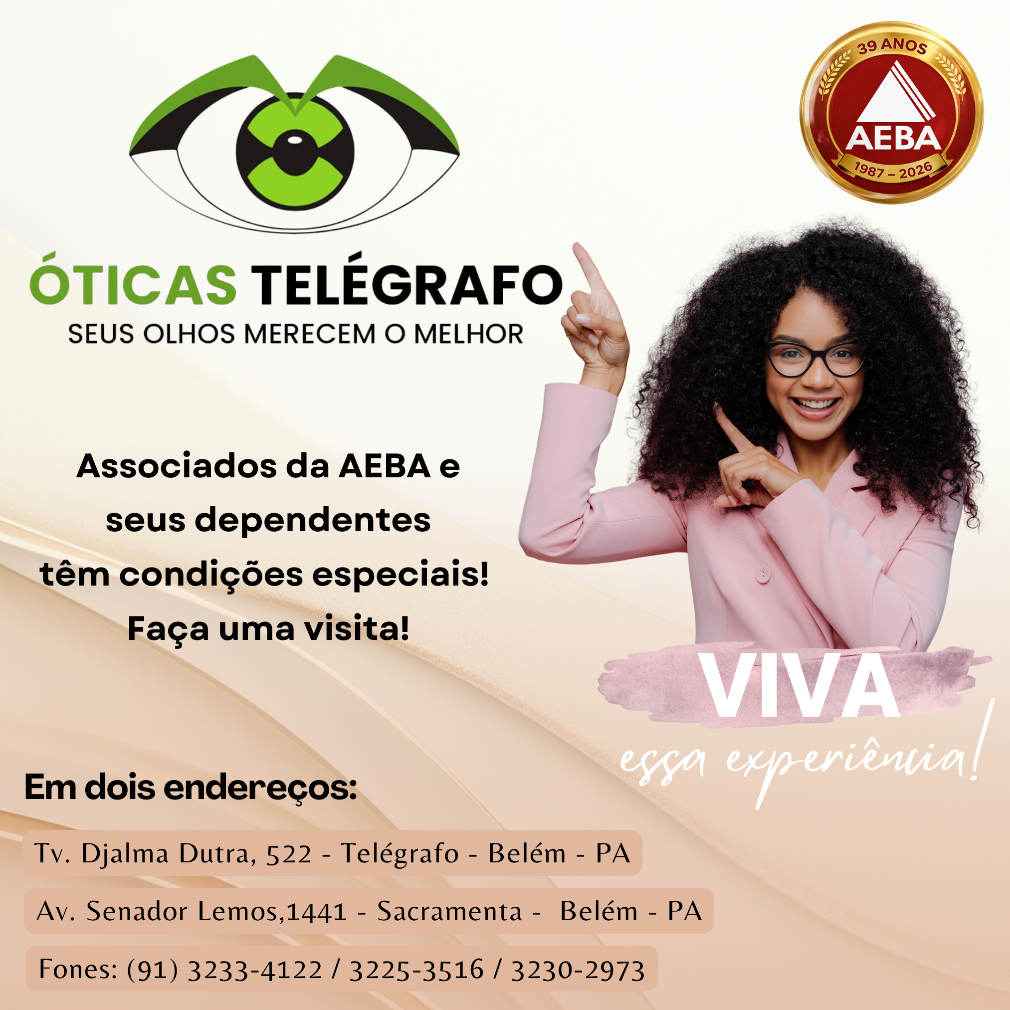 Associados e associadas da AEBA, e seu dependentes têm condições especiais na compra de óculos e lentes de contato nas Óticas Telégrafo, uma parceria de décadas em prol da saúde e do bem estar.